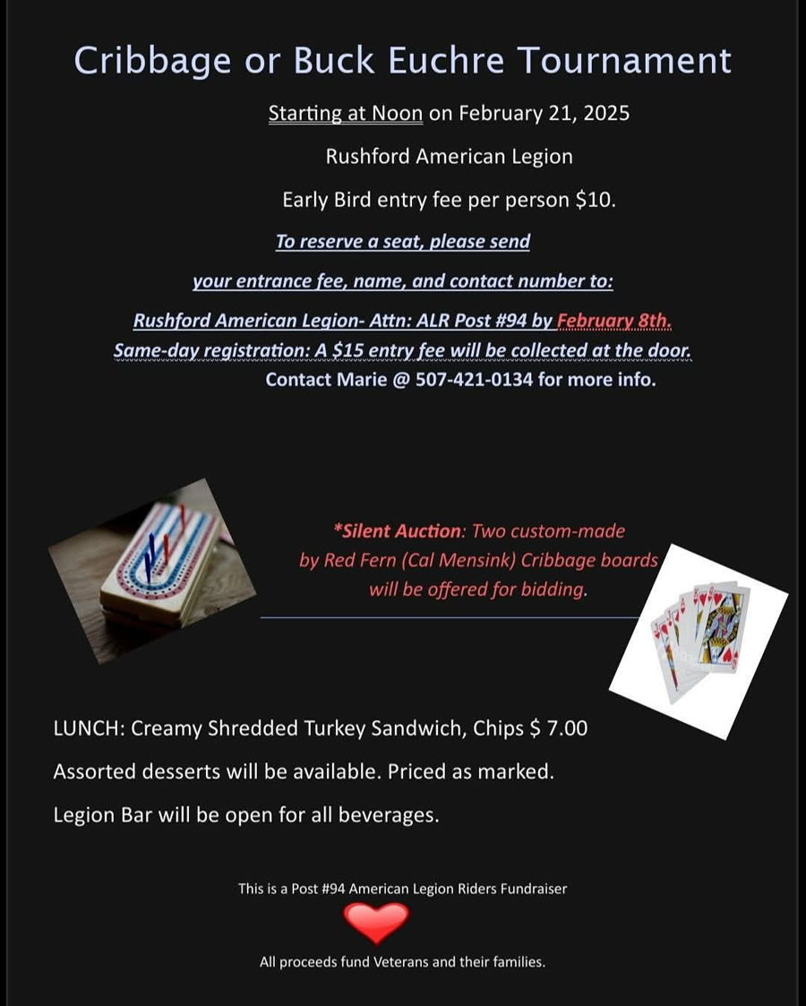 Cribbage or Buck Euchre Tournament + Add to Google Calendar + iCal / Outlook export 00 days 00 hours 00 minutes 00 seconds Date Feb 21 2026 Time 12:00 pm Category Community Event Share this event